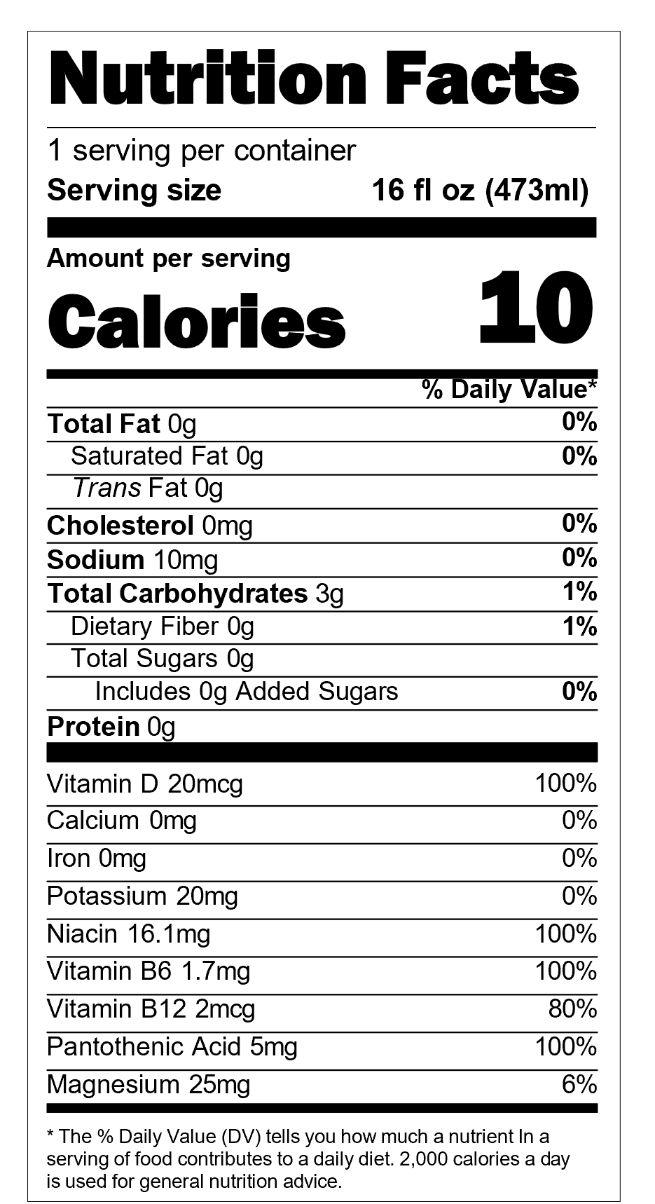 Natural Flavors, Malic Acid, Inulin Fiber, BCAA 2:1:1 (L-Leucine, L-Valine, L-Isoleucine), Lion's Mane Mushroom Extract (4:1), Magnesium Citrate, Green Tea Extract, Sucralose, L-Theanine, Alpha-GPC, Potassium Sorbate, Sodium Benzoate, Niacin (Vitamin B3), Cholecalciferol (Vitamin D3), Calcium D Pantothenate (Vitamin B5), Pyridoxine Hydrochloride (Vitamin B6), Cyanocobalamin (Vitamin B12).